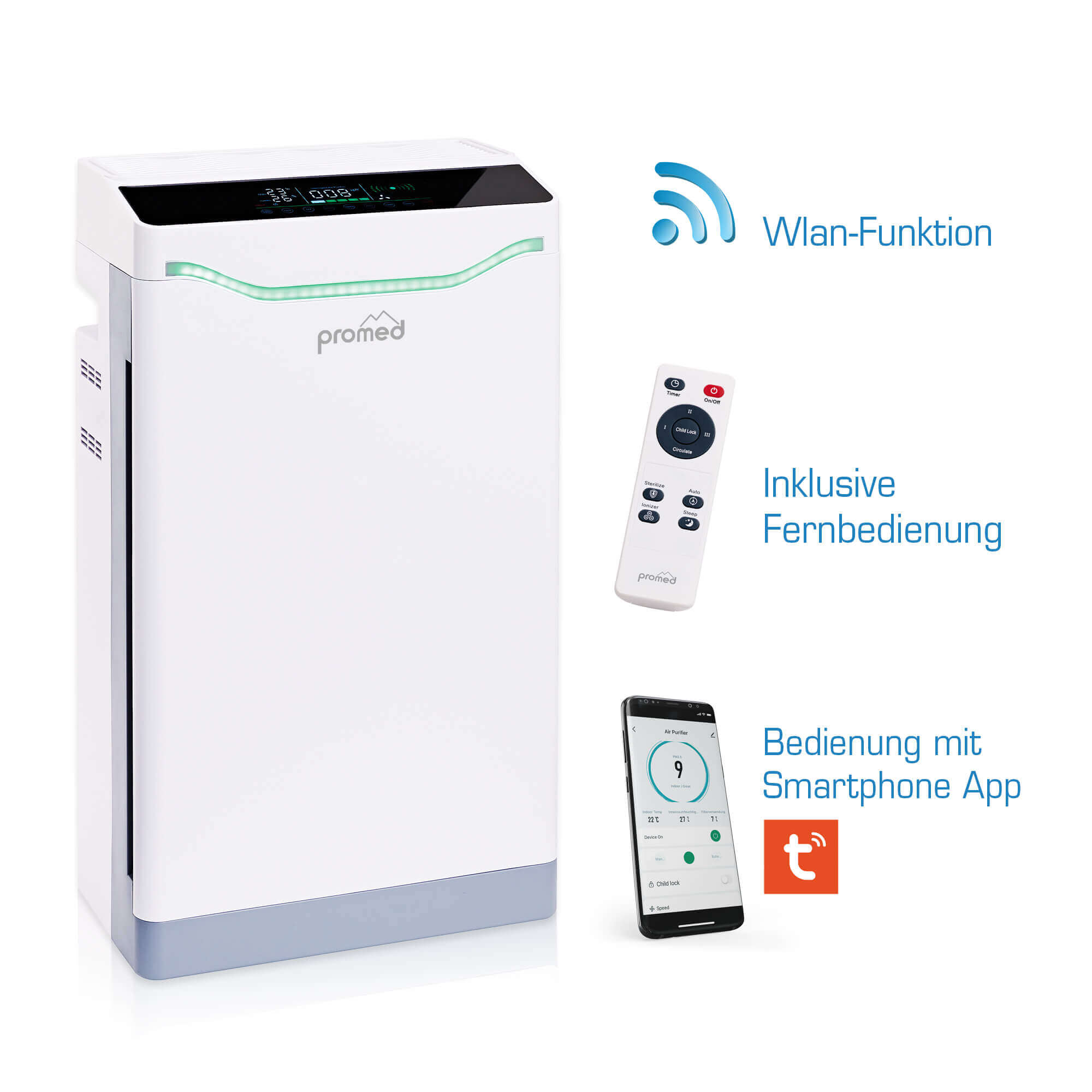 3-stufige Farbanzeige AQI fu#x308;r die Luftqualität (Air Quality Indicator), integrierter Partikelsensor; Timer Funktion von 1 bis 9 Stunden