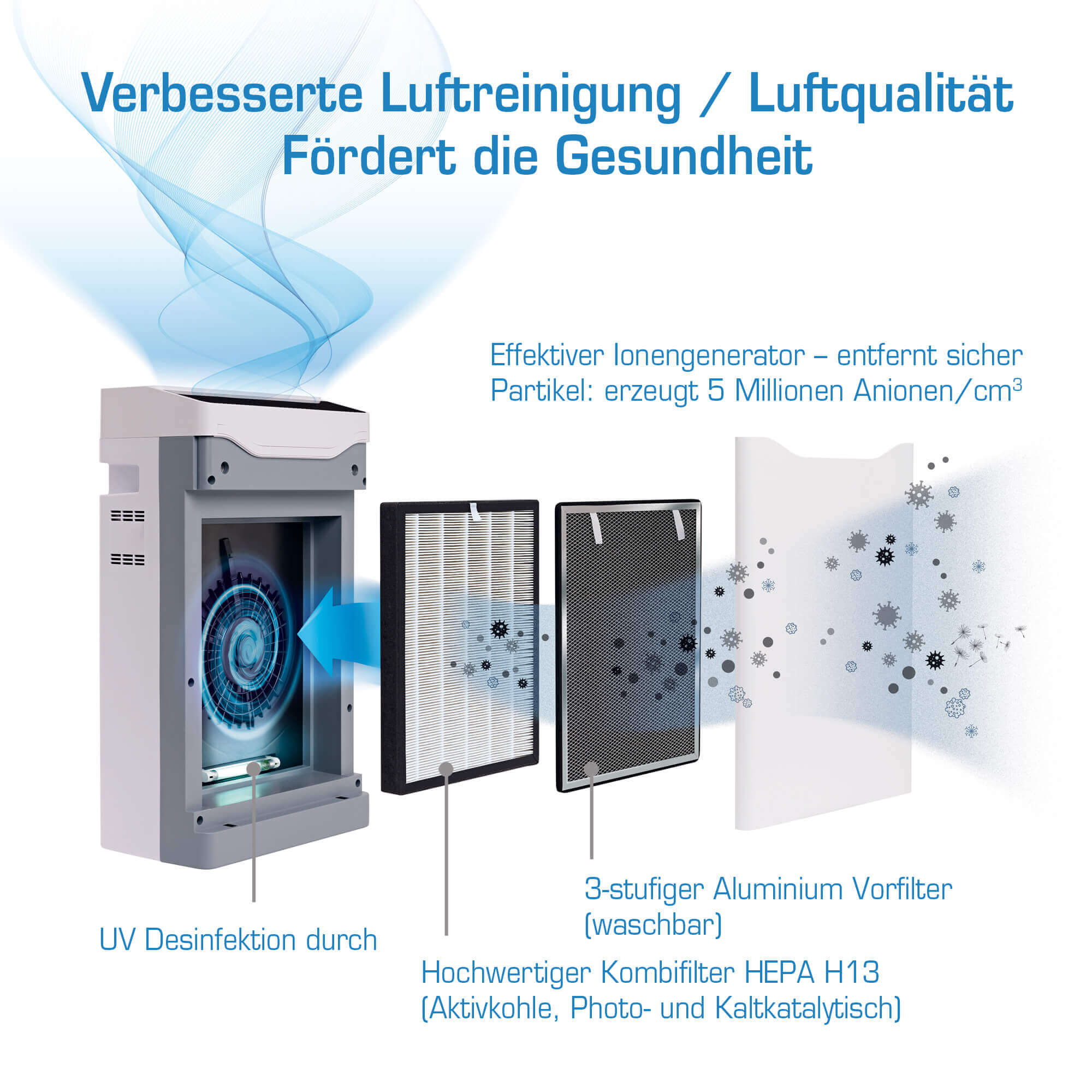 Hohe Filterkapazität durch Kombifilter (hochwertiger HEPA-Filter H13, Aktivkohle, Photokatalytisch, Kaltkatalytisch)